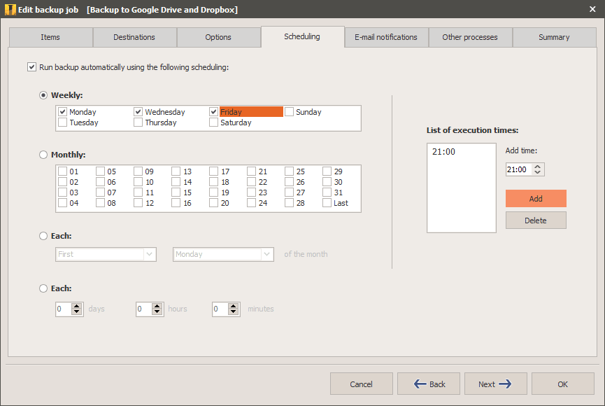 Among the most important features required of a backup software, there are definitely notification and reporting functions. Iperius Backup allows you to be always aware of the status of your backup, as it can automatically send an e-mail after each backup or only in case of errors. The backup can be scheduled at specific days and times and you can keep an history of all backup operations performed.